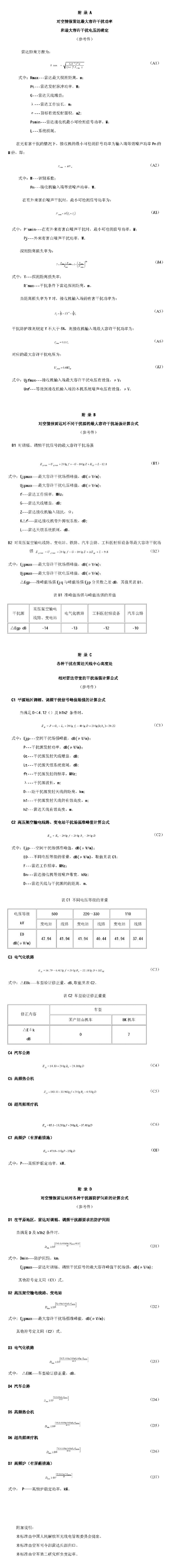 注:a.特殊情况下,按干扰防护准则的要求,参照有关附录进行测算。